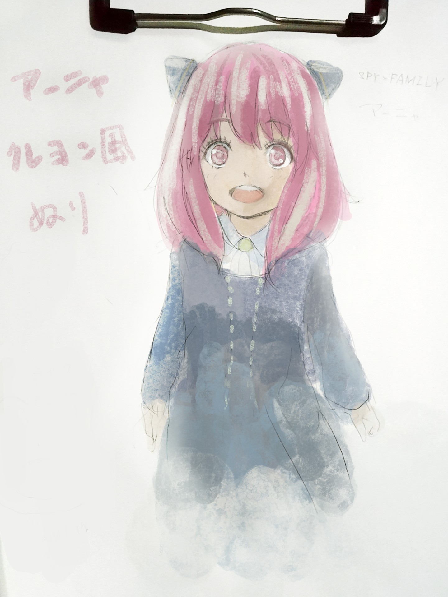 それでアーニャですが、アナログじゃないけど写真にそのままペイントソフトでクレヨンブラシで色塗りサクッとしてみました、資料見てないので色違ってたらすみません。