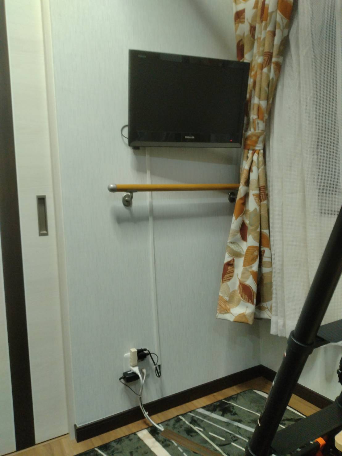 せっかくのデュアルモニターアームも部屋が狭いので左外して、外した分は壁掛けにして配線隠してテレビ専用にしました。線がないのはスッキリ( ^^)
